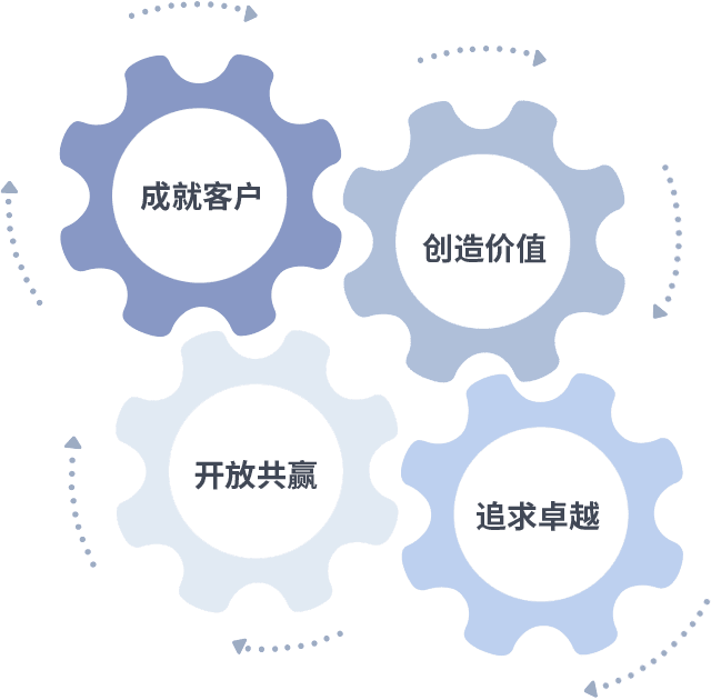 成就客户是一切决策的出发点,,,创造价值是衡量所有工作的标准,,,追求卓越是我们做事做人的态度,,,,开放共赢是我们的格局也是最终的结果。。价值观的齿轮环环相扣,,推动着组织里的每个人不断向前。。。。